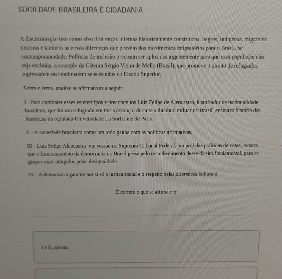 September 30, 2024 - Questão 10 A discriminação tem como alvo diferenças internas historicamente construídas, negros, indígenas . migrantes internos e também as novas diferenças que provêm dos movimentos imigratórios para o Brasil. na contemporaneidade.
