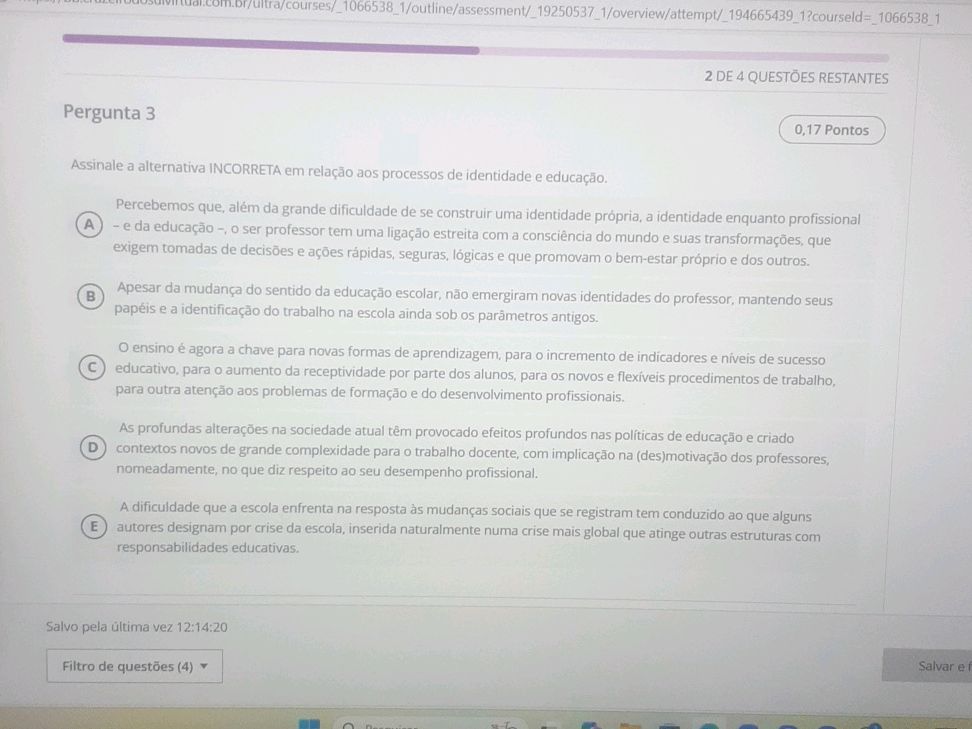 Assinale a alternativa INCORRETA em relação aos objetivos e às características da avaliação formativa. a. Tem por objetivo auxiliar o professor a ajustar seu planejamento, seu plano de ensino e seu plano de aula às reais necessidades de aprendizagem.