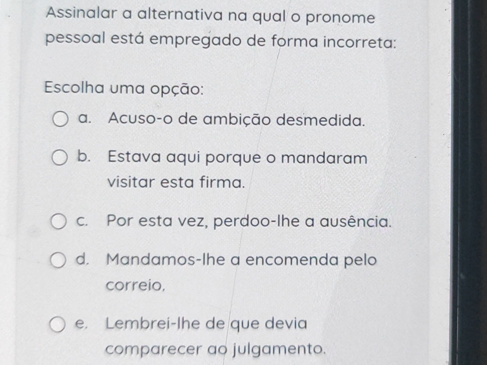 Click here to get an answer to your question Assinalar a alternativa na qual o pronome pessoal está empregado de forma incorreta: Escolha uma. O pronome " o " é usado corretamente como objeto direto do verbo "mandar". c. Por esta