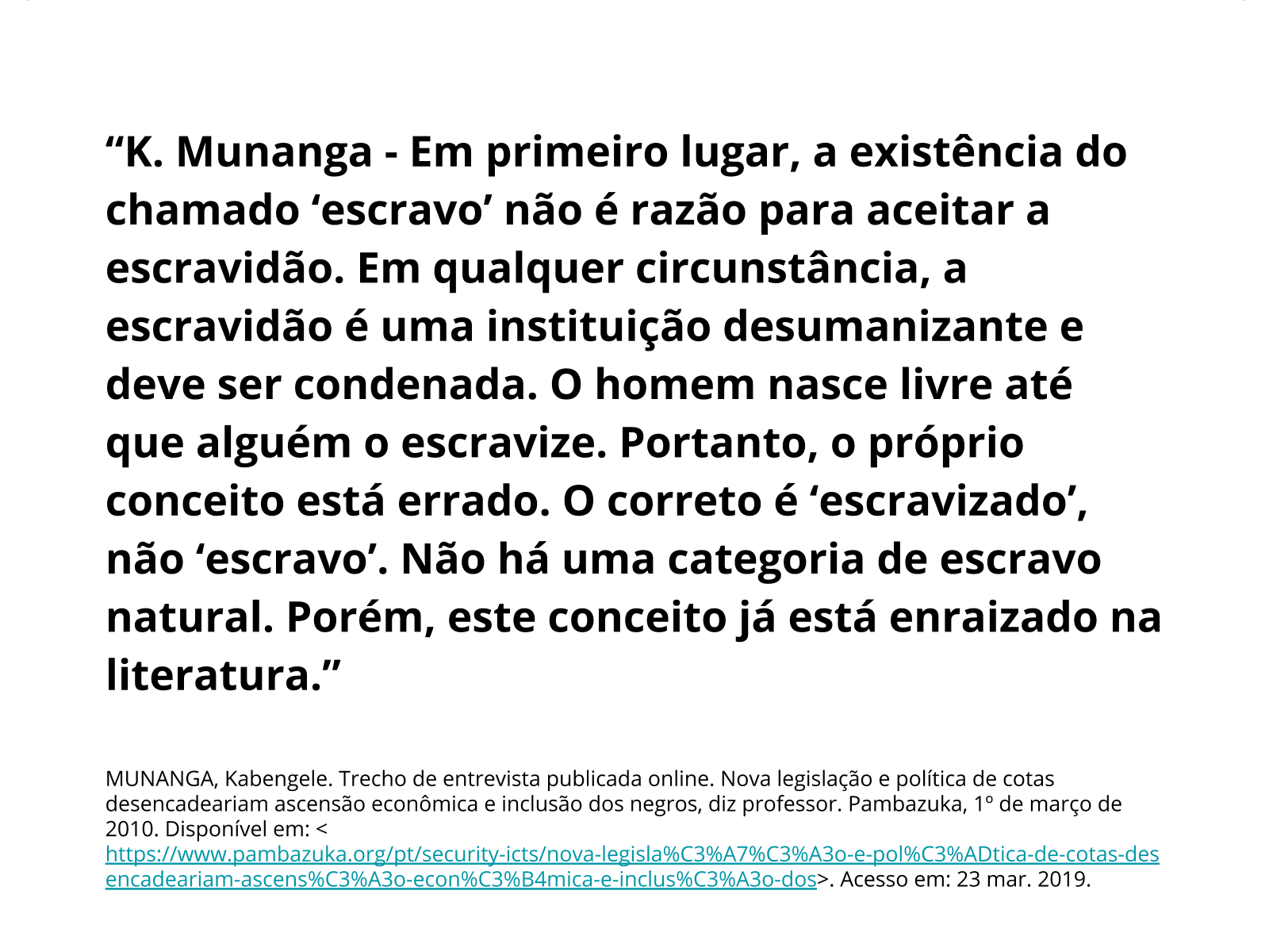 Um dos primeiros passos foi distinguir “ escravo ” e “ escravizado ”, sendo o último, de acordo com o antropólogo Kabengele Munanga, o termo correto a ser usado. Escravizado indica a situação pela qual a pessoa passou, que a colocou nessa situação.