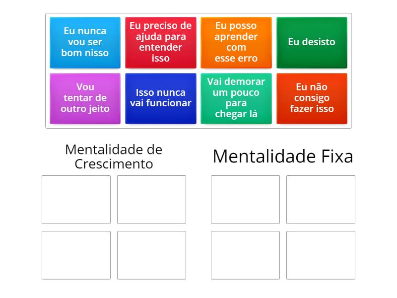 Mentalidade fixa define o nosso carate inteligencia e habilidade criativa sao dados estaticos e nao podem ser mudados de maneira significativa para isso se esforçar pelo sucesso e evitar o fracasso a todo custo torna-se uma maneira de manter a sensaçao de ser inteligente ou habilidoso ja a mentalidade de crescimento define -se pelo desafio