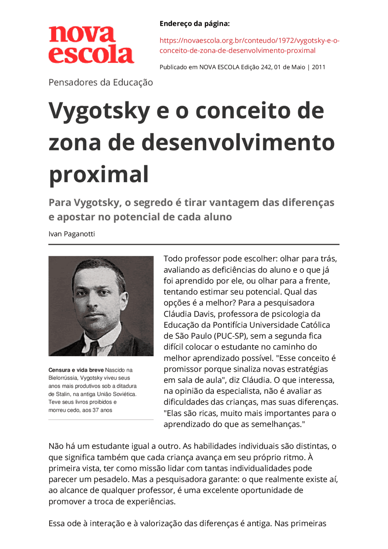 Zona de Desenvolvimento Proximal: um conceito fundamental para a prática pedagógica. ObservaçãoCom base nesse trabalho pude compreender o significado e os conceitos da zona de desenvolvimento proximal, e seus níveis de desenvolvimentos : o real e potencial.