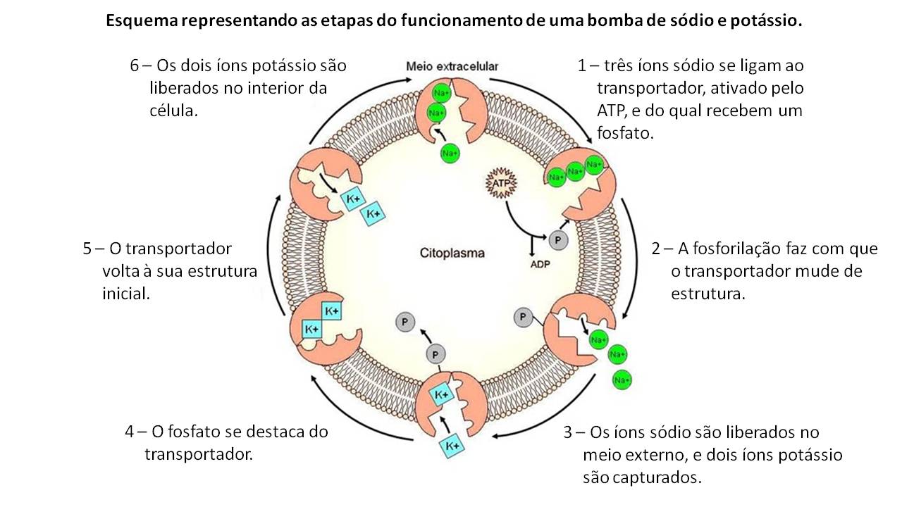 A bomba de sódio e potássio é uma ATPase, ou seja , catalisa a transformação da molécula de ATP em ADP. Esse processo é feito às custas da retirada de três íons da célula, ao mesmo tempo que entram na mesma dois íons potássio .