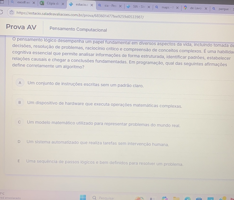 A questão aborda a definição de algoritmo na programação, relacionando-o com o pensamento lógico . A definição correta enfatiza a sequência ordenada e precisa de passos para solucionar um problema.