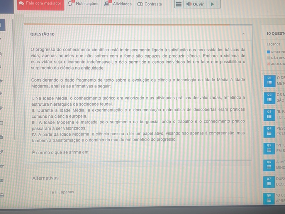 Durante a Idade Média, a experimentação e a documentação matemática de descobertas eram práticas comuns na ciência europeia. III. A Idade Moderna é marcada pelo surgimento da burguesia, onde o trabalho e o conhecimento prático passaram a ser valorizados.
