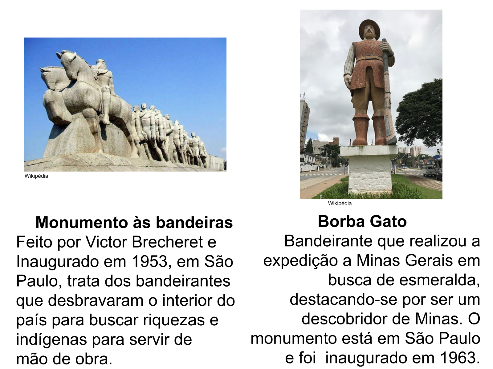 Os bandeirantes passaram, então, a se concentrar na exploração de riquezas minerais. Na capital paulista, outrora vila e centro irradiador das expedições bandeirantes , ergueu-se o Monumento às Bandeiras, de Victor Brecheret, um dos mais importantes escultores brasileiros .